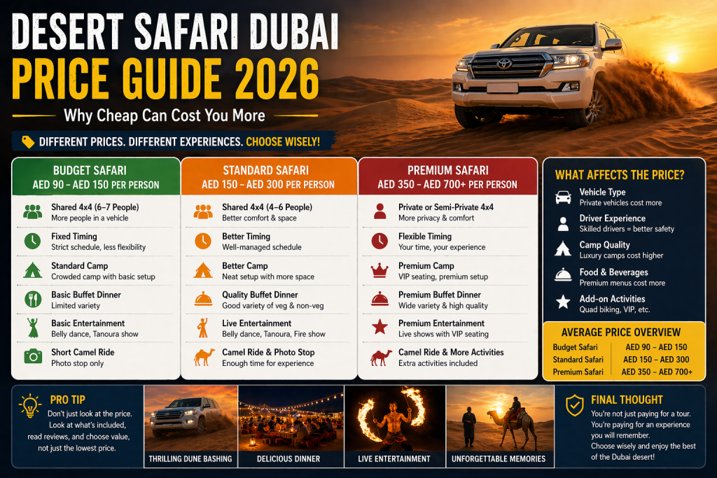 A desert safari in Dubai isn’t a single product. It’s a combination of multiple elements — transport, driver skill, group size, camp quality, food, and overall management.