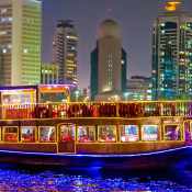 Enjoy the moonlight dinner across the Dubai Creek in a traditional wooden Dhow, decorated with colorful lights and sailing across the Creek where you can see different landmarks of old Dubai. While cruising you can enjoy the sumptuous Buffet Dinner with a wide variety of Continental and Oriental dishes, along with an excellent selection of beverages available onboard free of cost. Moreover, you can enjoy the varied live entertainments in the form of Magic Show or Tanoura Show.